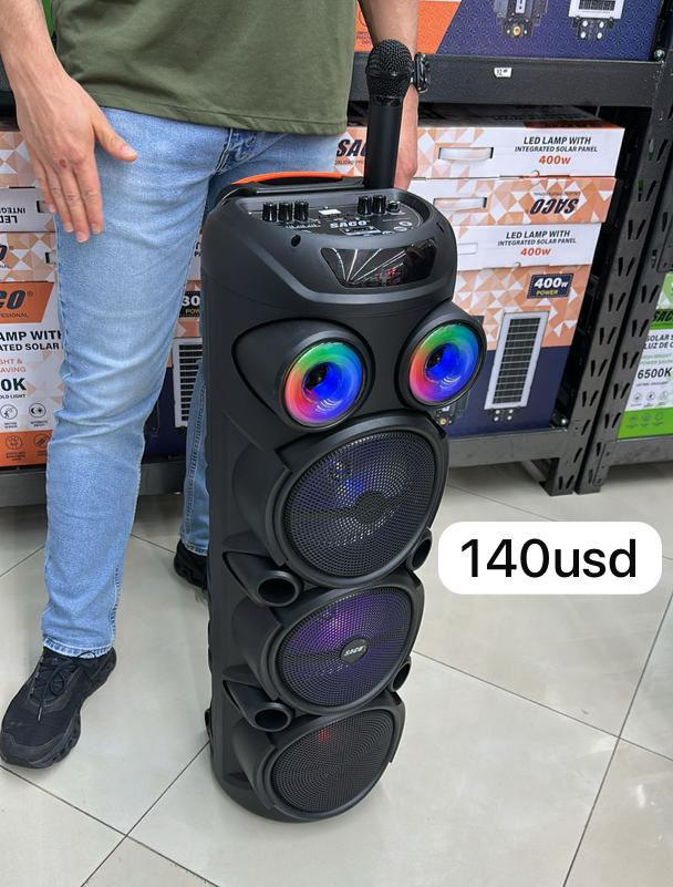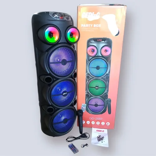 El altavoz tiene un diseño de triple woofer de 8 pulgadas, luces LED de colores y un micrófono. Es un sistema de sonido portátil con un asa para transportarlo.